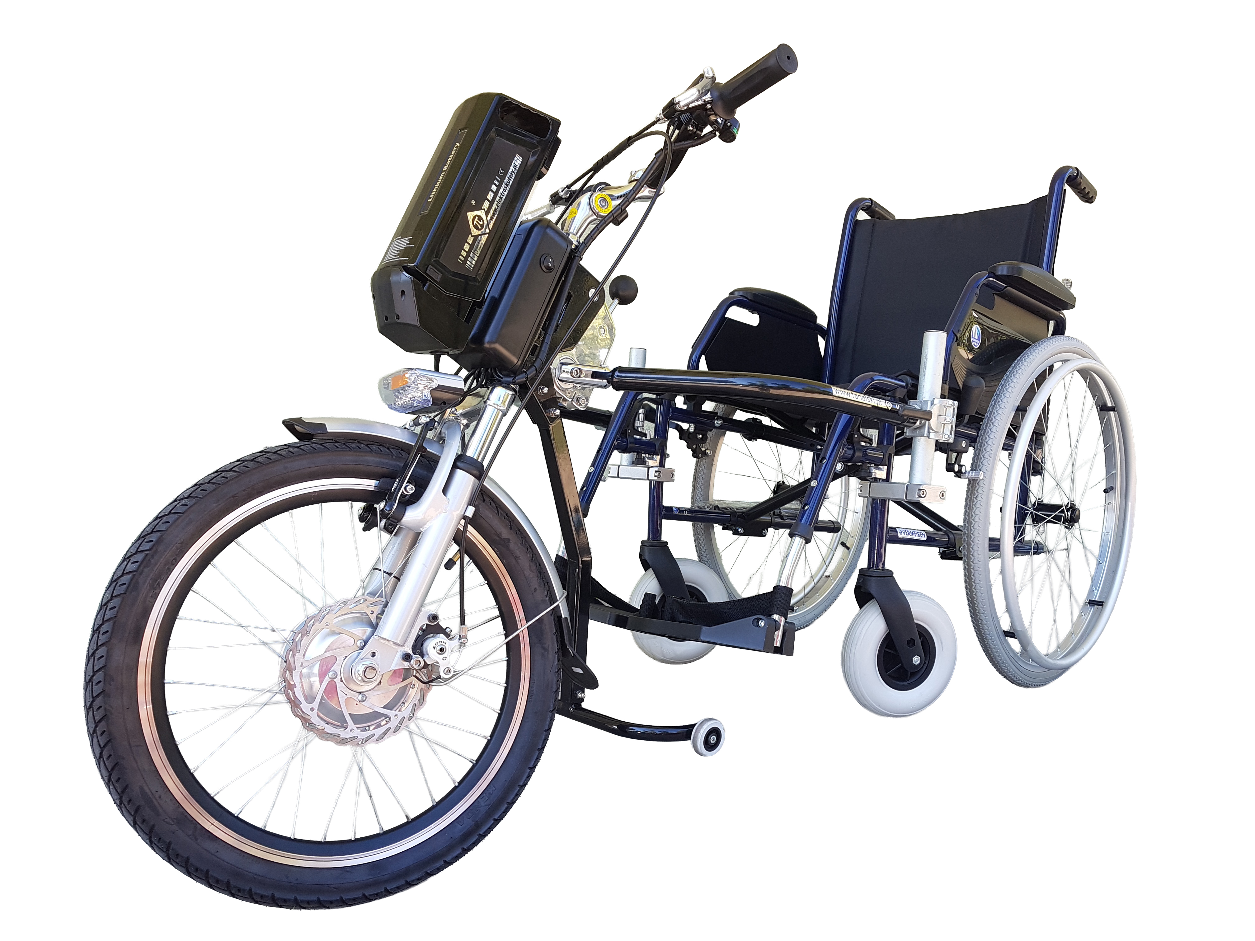 Podczepianie napędu do wózka polega na zaciśnięciu zacisków do rur, które są przytwierdzone do wózka inwalidzkiego i podniesieniu kierownicy. W tym momencie małe kółka wózka unoszą się a zamek zapina się samoczynnie i wózek jest gotowy do jazdy.